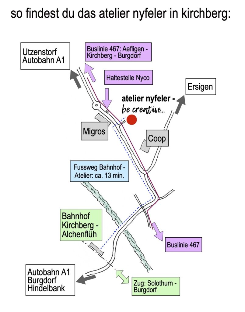 busverbindung aefligen – burgdorf (linie 467) bis station „nyco“ (bei migros), danach kurzer fussweg zum atelier.